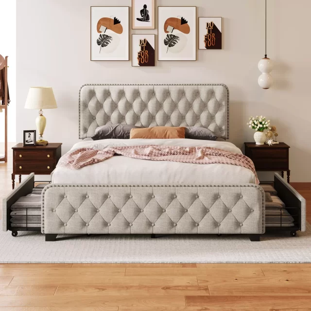 Our bed frame is more than just a piece of furniture; it’s a lifestyle choice. The modern design style, combined with the functionality of adjustable features and storage, makes it ideal for contemporary living spaces. The teak wood type and MDF panel type speak volumes of its quality and durability, ensuring you a long-lasting product. Whether you’re looking for a bed that adds a touch of elegance to your space or one that promises comfort, our Velvet Tufted Bed Frame is the answer.