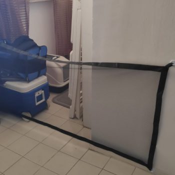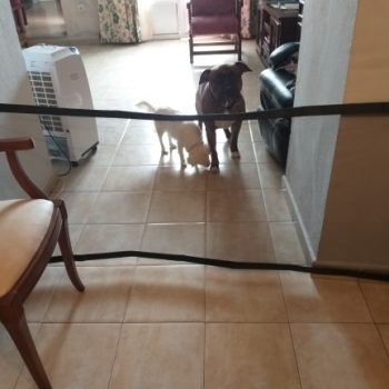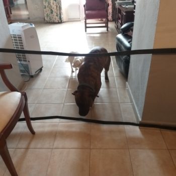 It’s easy to store since it’s flexible and takes up way less space than a baby gate. It holds back my dogs and is very easy to install onto any door or pathway.