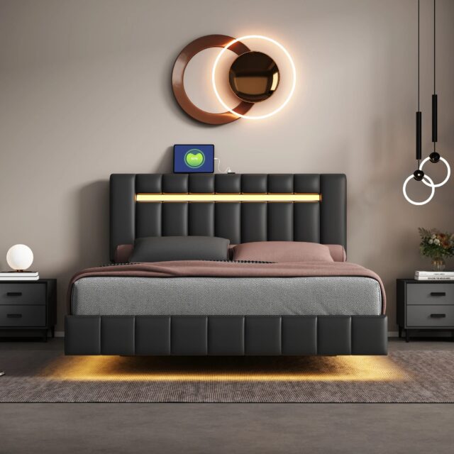What sets this bed apart is its unique floating design combined with modern LED lighting and practical USB charging. It’s not just a bed frame; it’s a lifestyle upgrade. It’s designed for those who appreciate both style and functionality in their furniture. Embrace the future of bedroom design with our Modern Queen Size LED Upholstered Platform Bed Frame. Transform your bedroom into a sanctuary of modern comfort and style today! Don’t wait to experience the ultimate in bedroom luxury. Click to add to cart and bring home the future of sleep and style!